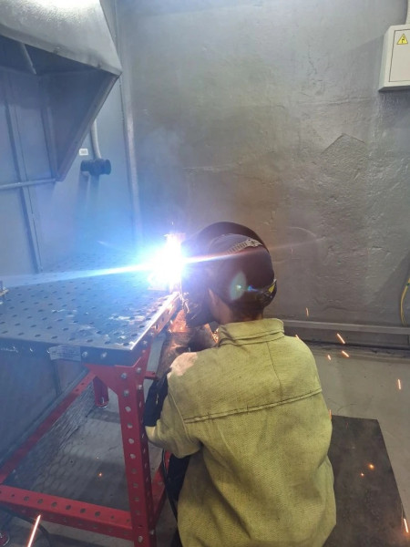 В рамках практического задания студенты работали со сварочным оборудованием, выполняя сварку таврового соединения из пластин двусторонним вертикальным швом.