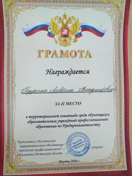 16 апреля 2026 года в ГБПОУ РО «ШРКТЭ им. ак. Степанова П.И.» проведена территориальная олимпиада профессионального мастерства по предпринимательству среди студентов профессиональных образовательных учреждений Ростовской области, в которой приняла участие студентка группы ОДЛ-21 Пуцкина Алевтина.