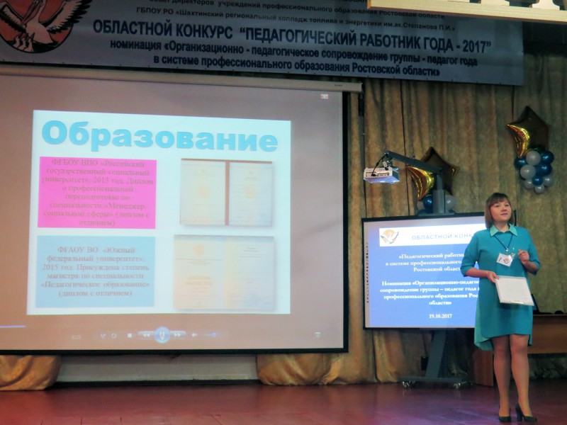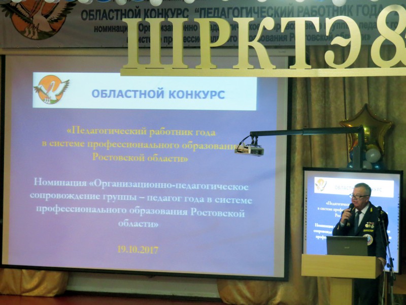 19 октября 2017 г. в Шахтинском региональном колледже топлива и энергетики им. ак. Степанова П.И состоялся финал областного конкурса «Педагогический работник в системе профессионального образования Ростовской области» в номинации «Организационно-педагогическое сопровождение группы - педагог года в системе профессионального образования Ростовской области».