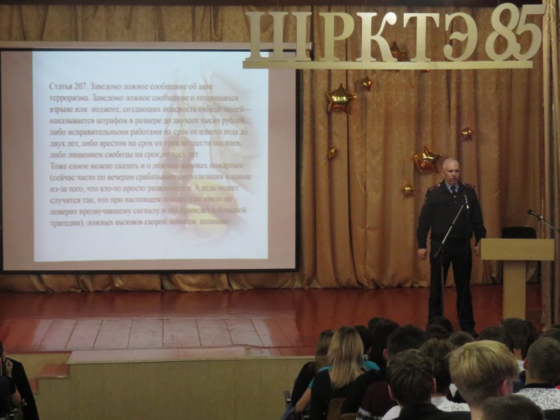 25 октября 2018г. в актовом зале колледжа для студентов механического факультета было проведено профилактическое мероприятие «Правопорядок и закон». Целью мероприятия было знакомство студентов с видами правонарушений и наказаниями за них. Рассказ получился содержательным, познавательным и интересным.