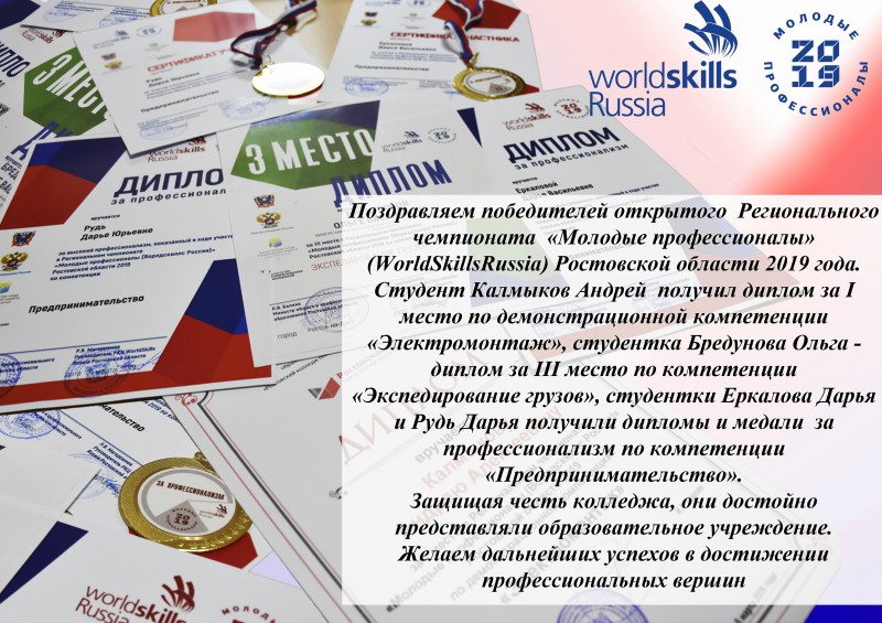 Студенты ШРКТЭ приняли активное участие по различным компетенциям и добились высоких результатов. Так студентка Бредунова Ольга Васильевна получила диплом за III место в Региональном чемпионате «Молодые профессионалы» (Ворлдскиллс Россия)» Ростовской области 2019 по компетенции «Экспедирование грузов», студент Калмыков Андрей Алексеевич – диплом за I место в Региональном чемпионате «Молодые профессионалы» (Ворлдскиллс Россия)» Ростовской области 2019 по демонстрационной компетенции «Электромонтаж», студенты Еркалова Дарья Васильевна и Рудь Дарья Юрьевна получили дипломы и медали за профессионализм, показанный в ходе участия в Региональном чемпионате «Молодые профессионалы» (Ворлдскиллс Россия)» Ростовской области 2019 по компетенции «Предпринимательство».