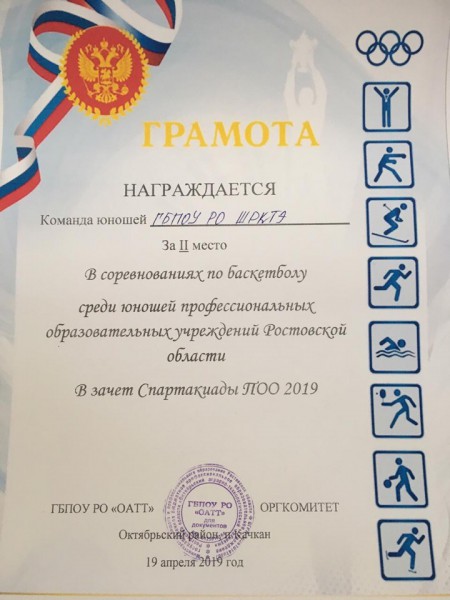 19.04.2019 г. сборная команда юношей Шахтинского регионального колледжа топлива и энергетики им.ак. Степанова П.И. приняла участие в соревнованиях по баскетболу, в зачет областной спартакиады среди обучающихся учреждений СПО г.Шахты. В соревнованиях участвовало шесть команд , где наша сборная заняла 2 место.