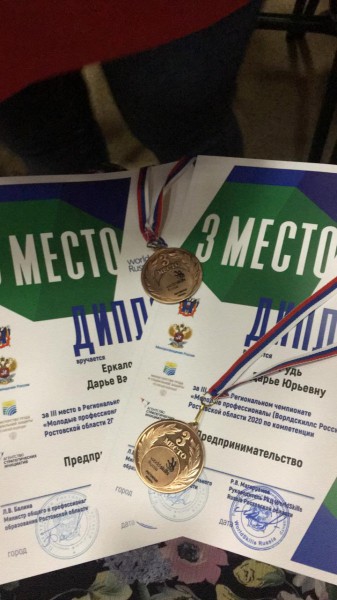 Студент Калмыков Андрей Алексеевич – диплом за II место по компетенции «Электромонтаж», студентки Еркалова Дарья Васильевна и Рудь Дарья Юрьевна получили дипломы за III место по компетенции «Предпринимательство».