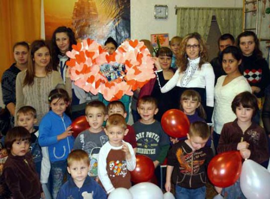 Во время конкурса «Очаровательная пара» началась акция «Дари добро». Эта огромная Валентинка колледжа с фотографией студентов и детей детского дома. Каждый присутствующий в зале получил сердечко, написал пожелания детям детского дома и поместил на общую Валентинку. Преподаватели, сотрудники и студенты собрали средства для детей детского дома и приобрели напольный ковер для игр, фрукты и сладости.