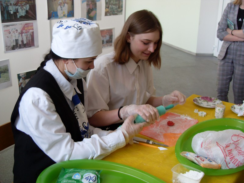 После первого этапа конкурса для всех присутствующих в холле был проведен мастер-класс, где студенты продемонстрировали мастерство приготовления изделий из мастики в виде цветов.
