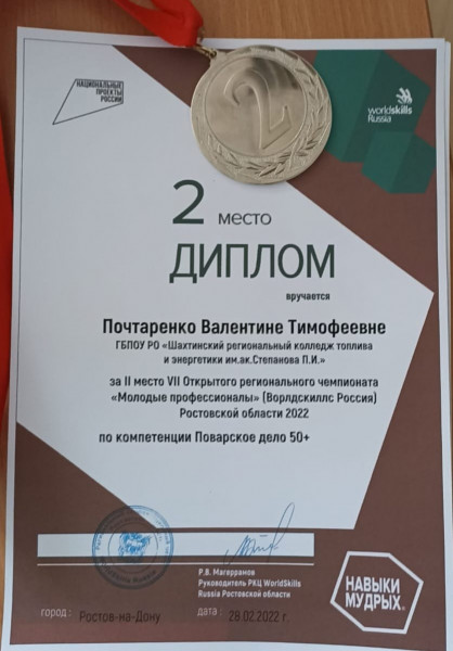 Почтаренко Валентина Тимофеевна, мастер производственного обучения, заняла II место в Региональном чемпионате «Молодые профессионалы» (Ворлдскиллс Россия)» Ростовской области 2022 по компетенции «Поварское дело 50 + Навыки Мудрых».