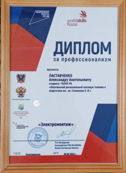 Ластавченко Александр, студент специальности 13.02.03 Электрические станции, сети и системы, получил диплом и медаль за профессионализм в Региональном чемпионате «Молодые профессионалы» (Ворлдскиллс Россия)» Ростовской области 2022 по компетенции «Электромонтаж».