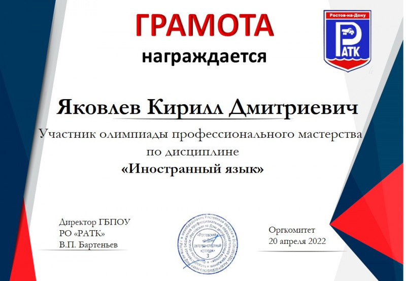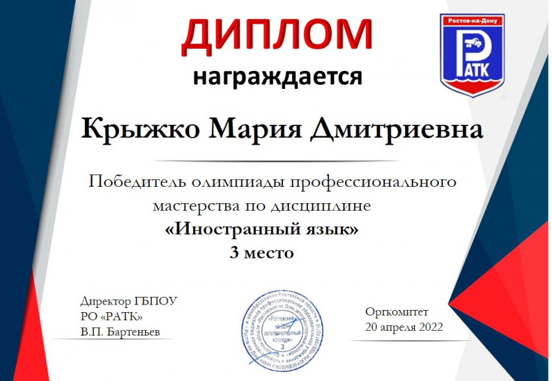 20 апреля 2022г. студенты колледжа приняли участие в областной олимпиаде профессионального мастерства по дисциплине «Иностранный язык» среди обучающихся средних профессиональных учреждений Ростовской области по укрупненной группе 23.00.00 Техника и технологии наземного транспорта, которая состоялась на базе ГБПОУ РО «Ростовский-на-Дону автотранспортный колледж».