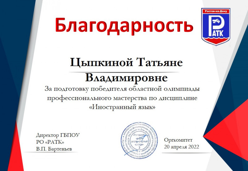 20 апреля 2022г. студенты колледжа приняли участие в областной олимпиаде профессионального мастерства по дисциплине «Иностранный язык» среди обучающихся средних профессиональных учреждений Ростовской области по укрупненной группе 23.00.00 Техника и технологии наземного транспорта, которая состоялась на базе ГБПОУ РО «Ростовский-на-Дону автотранспортный колледж».