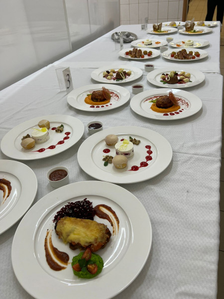 В течение конкурса участникам необходимо было приготовить горячее блюдо из птицы (филе) с двумя гарнирами и десерт.