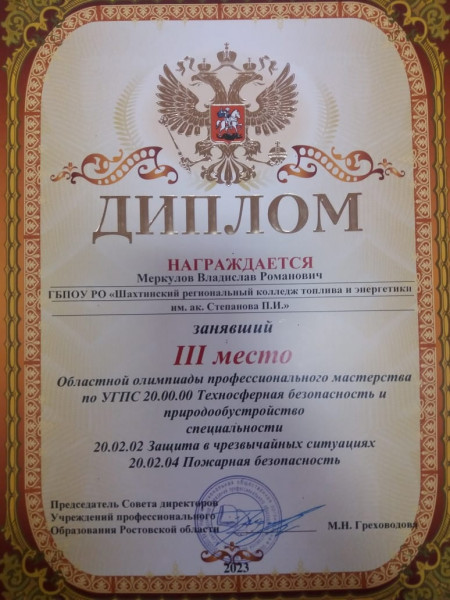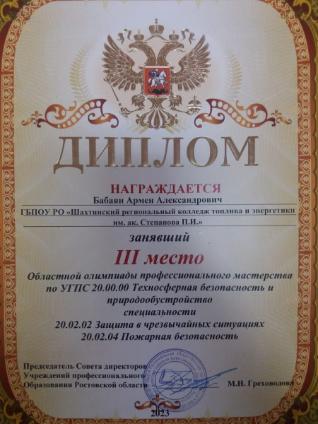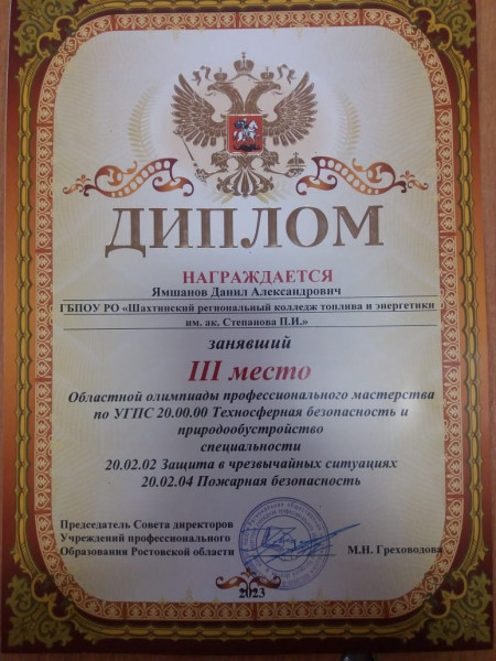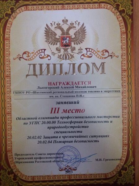 19 мая команда Шахтинского регионального колледжа топлива и энергетики им.ак. Степанова П.И. приняла участие в Областной олимпиаде профессионального мастерства по УГПС 20.00.00. «Техносферная безопасность и природообустройство» специальности 20.02.02 Защита в чрезвычайных ситуациях. Наша команда, под руководством Краснова Ивана Геннадьевича, заняла почетное третье место.