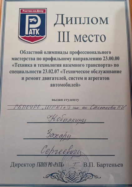 24 марта 2024 года студент нашего колледжа принял участие в областной олимпиаде профессионального мастерства по профильному направлению 23.00.00 «Техника и технология наземного транспорта», который проходил в Ростовском – на – Дону автотранспортном колледже.