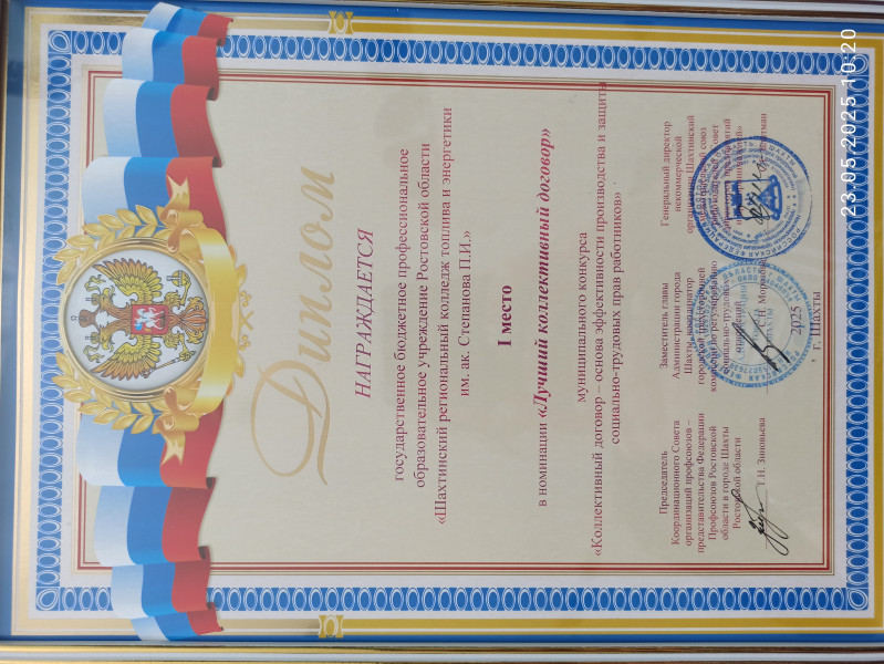 22.05.2025г Подведены итоги муниципального конкурса «Коллективный договор – основа эффективности производства и защиты социально-трудовых прав работников» среди предприятий и организаций города Шахты, в котором колледж принял участие и занял 1 место в номинации «Лучший коллективный договор»