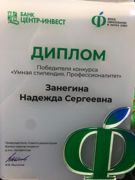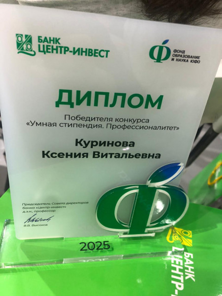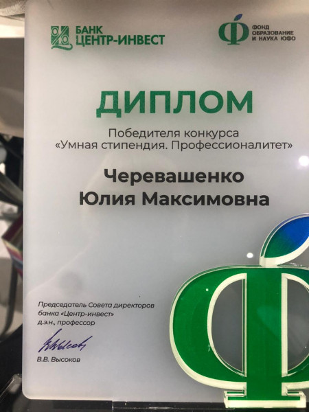 Студенты специальности 38.02.03 Операционная деятельность в логистике, Занегина Надежда, Куринова Ксения, Черевашенко Юлия, Шакина Елизавета под руководством наставника преподавателя, Ковалевой Елены Юрьевны приняли участие в конкурсе на получение стипендии банка «Центр-Инвест» и в торжественной обстановке награждены сертификатами на получение стипендии из фонда целевого капитала «Образование и наука ЮФО» в сумме 30 000 рублей.